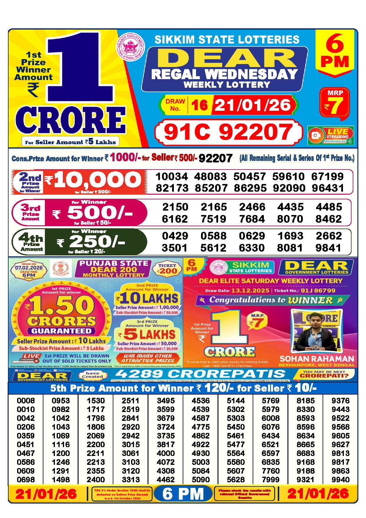 Dear Lottery Live Results Today gives you a chance to win big prizes. The first prize is Rs.1 crore, the second prize is Rs.9000, the third prize is Rs.450, the fourth prize is Rs.250 and the fifth prize is Rs.120.